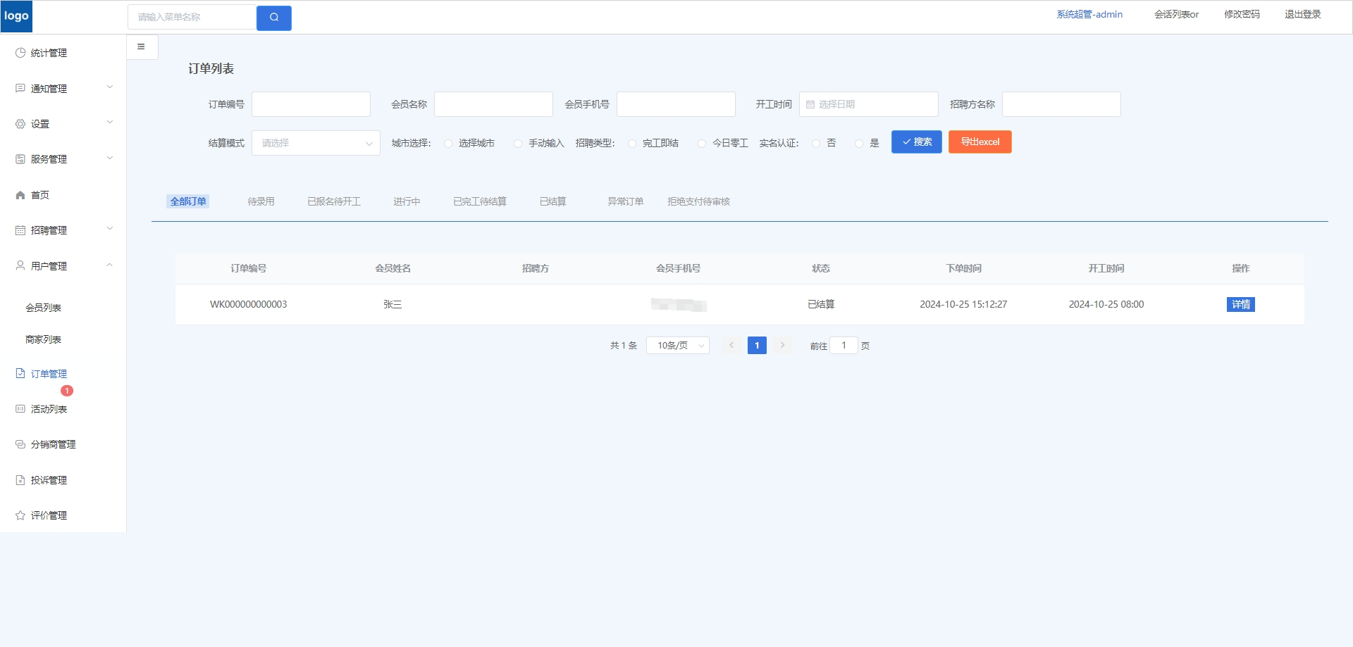 管理订单信息,包括订单的创建、处理和跟踪,实现兼职招聘订单的全流程规范化管理。