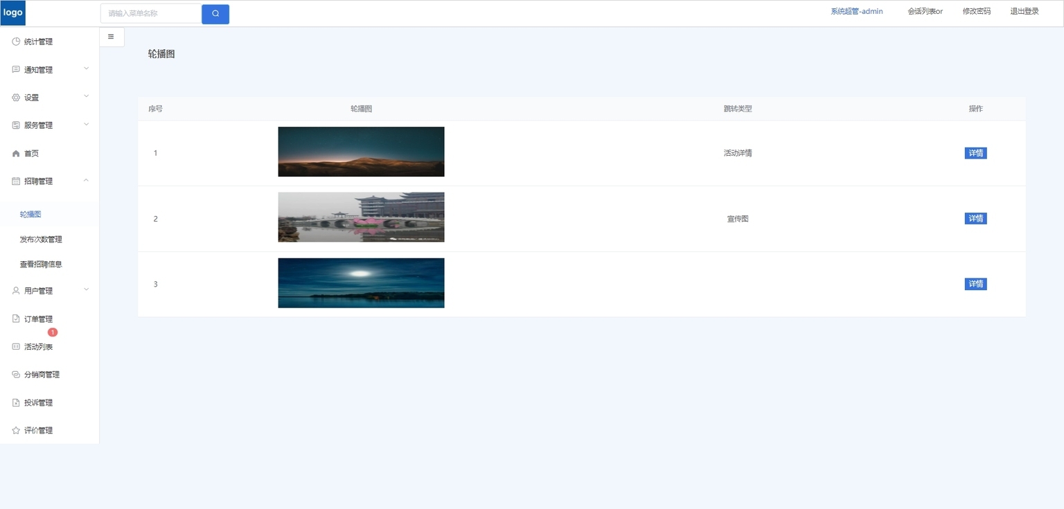 轮播图:管理网站或应用的轮播图,用于展示重要信息或广告,提升平台视觉吸引力与信息触达效率。