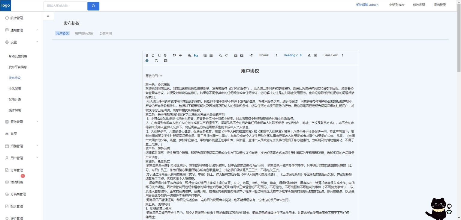 发布协议:展示平台的服务协议和使用条款,确保用户了解并遵守规则,保障平台运营的合规性。