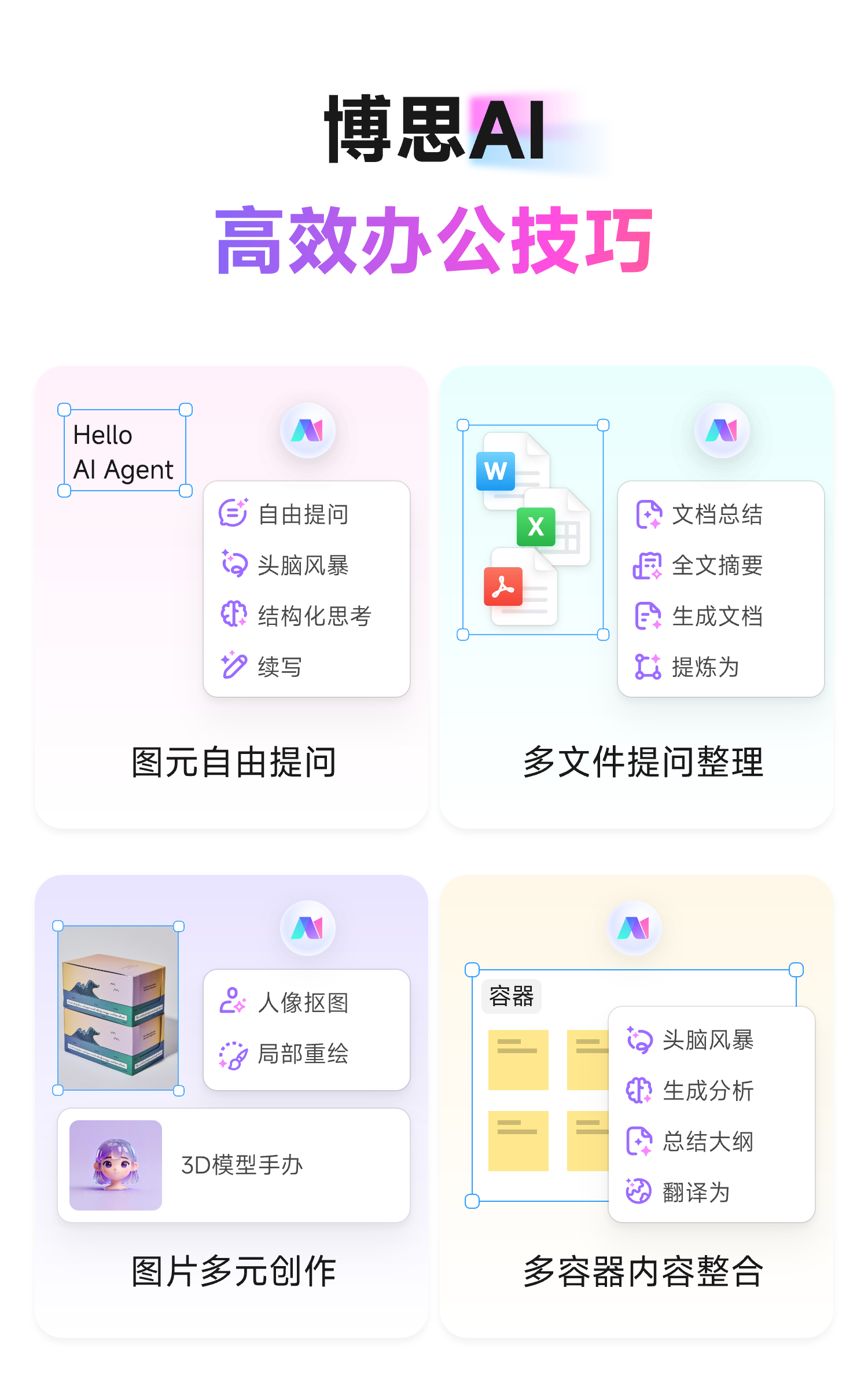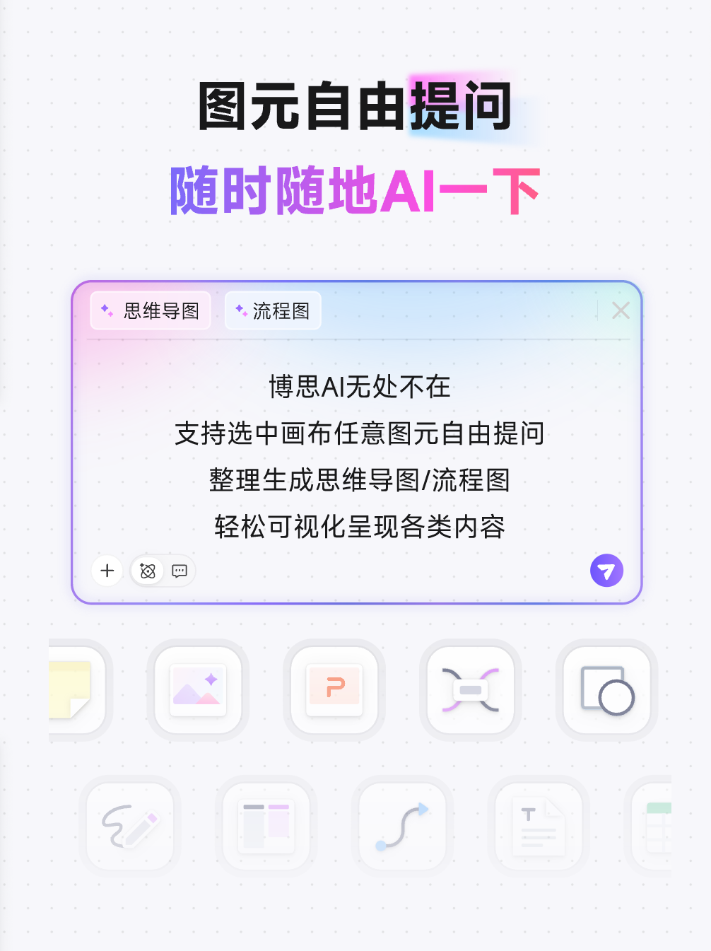 boardmix AI(博思 AI)是 boardmix 在线白板中集成的超级智能体,依托于 boardmix 的无限画布之上,选择任意画布图元即可自由提问,或是下达指令,经由 boardmix AI 背后的各个智能体处理后,生成的内容同样会汇集到无限白板之中,仅用一个工具即可完成内容的创作、可视化呈现、分享和多人协作等。
