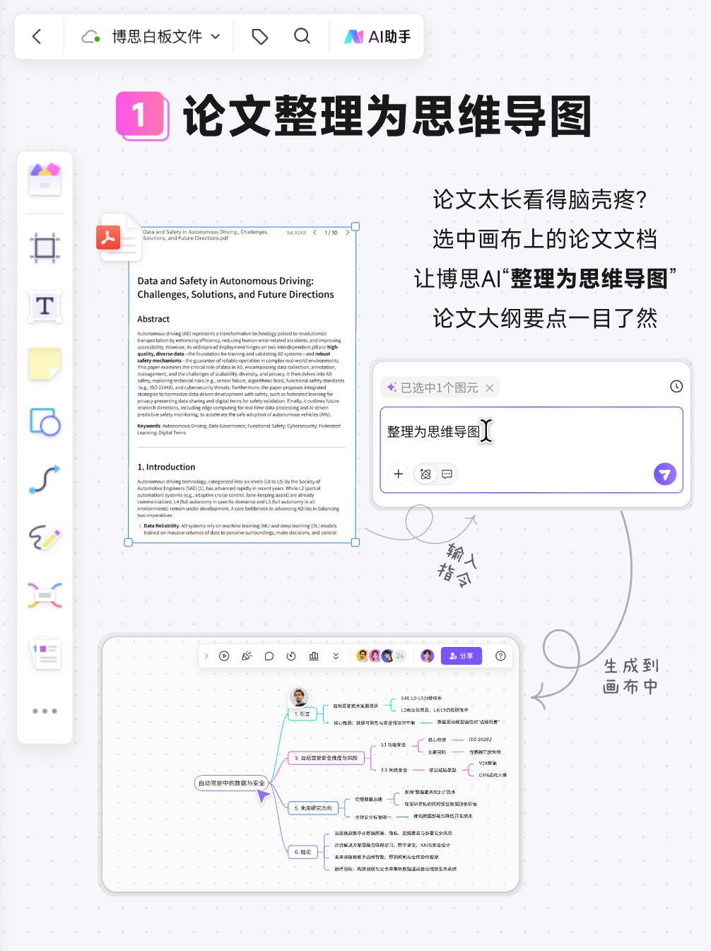 在 boardmix 画布上直接上传或粘贴一份 PDF 格式的学术论文。鼠标单击选中该 PDF,在弹出的 AI 浮窗中输入指令(或点击预设):“整理为思维导图”。