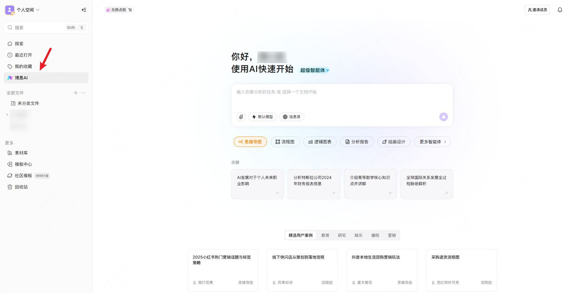 boardmix AI 使用方法:在浏览器打开 boardmix 博思白板首页,进入 boardmix 工作台,点击左侧的“博思 AI”标签,打开 boardmix AI 超级智能体,下方预置了多个智能体,点击“更多智能体”,可打开智能体商店,查看 boardmix AI 已上架的所有智能体。