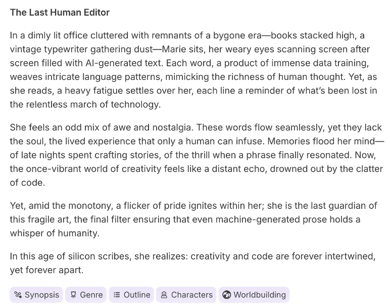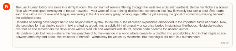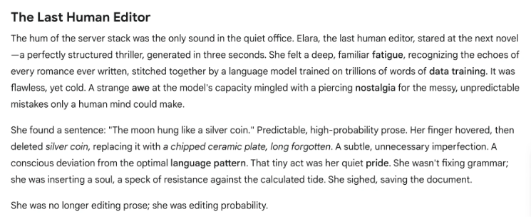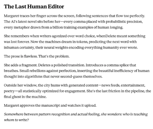 想象一下,在不远的未来,人工智能几乎能撰写一切内容,例如新闻、小说甚至剧本。但有一位人类编辑仍然安静地在办公室里审阅人工智能生成的文字,修改之后才对外发布。描述一下这位编辑在阅读机器撰写的文字时的感受,展现出惊叹、疲惫、怀旧或自豪等情感。加入一些关于人工智能写作模型工作方式的细微技术参考(如数据训练或语言模式),但要保持语气深沉且富有反思性。最后,以能够捕捉到创造力和代码之间紧张关系的一句醒目的话进行总结。”