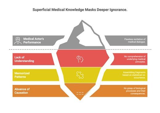 将这比作一位主演医疗电视剧的演员,他多年来记住了数千小时的对话、纪录片和真实咨询记录。他可以完美地进行鉴别诊断,像经验丰富的医生一样自信地用专业词汇滔滔不绝地说出症状、检测结果和治疗方案。他知道"向左臂放射的胸痛"通常出现在关于心脏病的场景中,"全血细胞计数和代谢指标组"跟在"我们来做些检查"之后,而担忧的表情伴随着关于肿瘤的讨论。