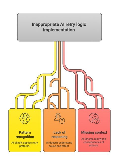 例如,为重试逻辑加固微服务听起来很简单——然而实际情况并非如此。要求 AI 助手"在失败时添加重试",你可能会得到一段在任何错误时都重试所有操作的代码。这对于幂等的(或无状态的)读取操作(例如"获取配置文件")来说没问题,因为重复调用只会返回相同的数据。将相同的逻辑应用于非幂等操作——扣款、创建订单、发送电子邮件、查询数据库——你就会招致灾难:重复扣款、重复订单、通知风暴、数据库中的重复记录。解决方法并非魔术,而是判断力。人类首先对操作进行分类——幂等与非幂等——仅在瞬态错误时重试,并且对于任何有副作用的操作,都需要幂等性密钥和服务端去重。虽然这仍然为人类开发者节省大量时间,但他们仍然需要将其技能和专业知知融入其中,否则灾难可能并且将会随机发生。