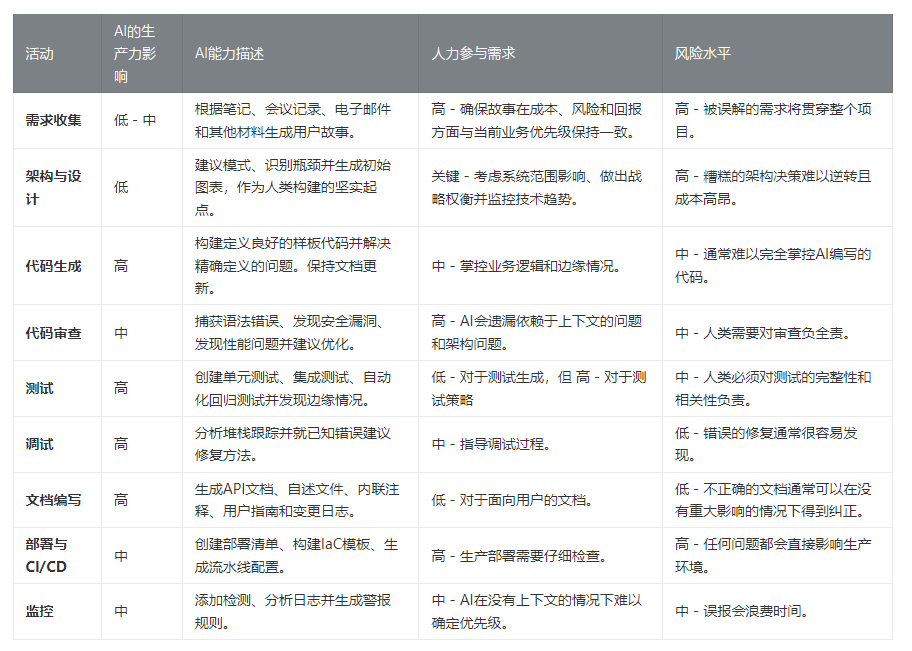 下表分析了 AI 对软件开发生命周期(SDLC)中不同活动的生产力影响,以及 AI 对每项活动的能力、所需的人力参与程度和每项活动的风险水平。