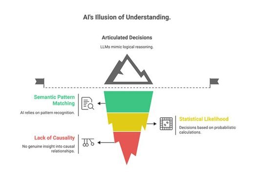 让人类难以理解这一点的是,LLM 在阐述其决策过程时具有令人信服的方式,常常模仿一种逻辑递进,暗示其对因果关系的理解,而实际上它们并不具备这种理解。它们通过拼凑统计上可能性高的人类推理文本片段来实现这一点。虽然这看起来像是逻辑推理,但它基于从训练数据中得出的概率计算,而非对步骤之间因果关系的直接理解。