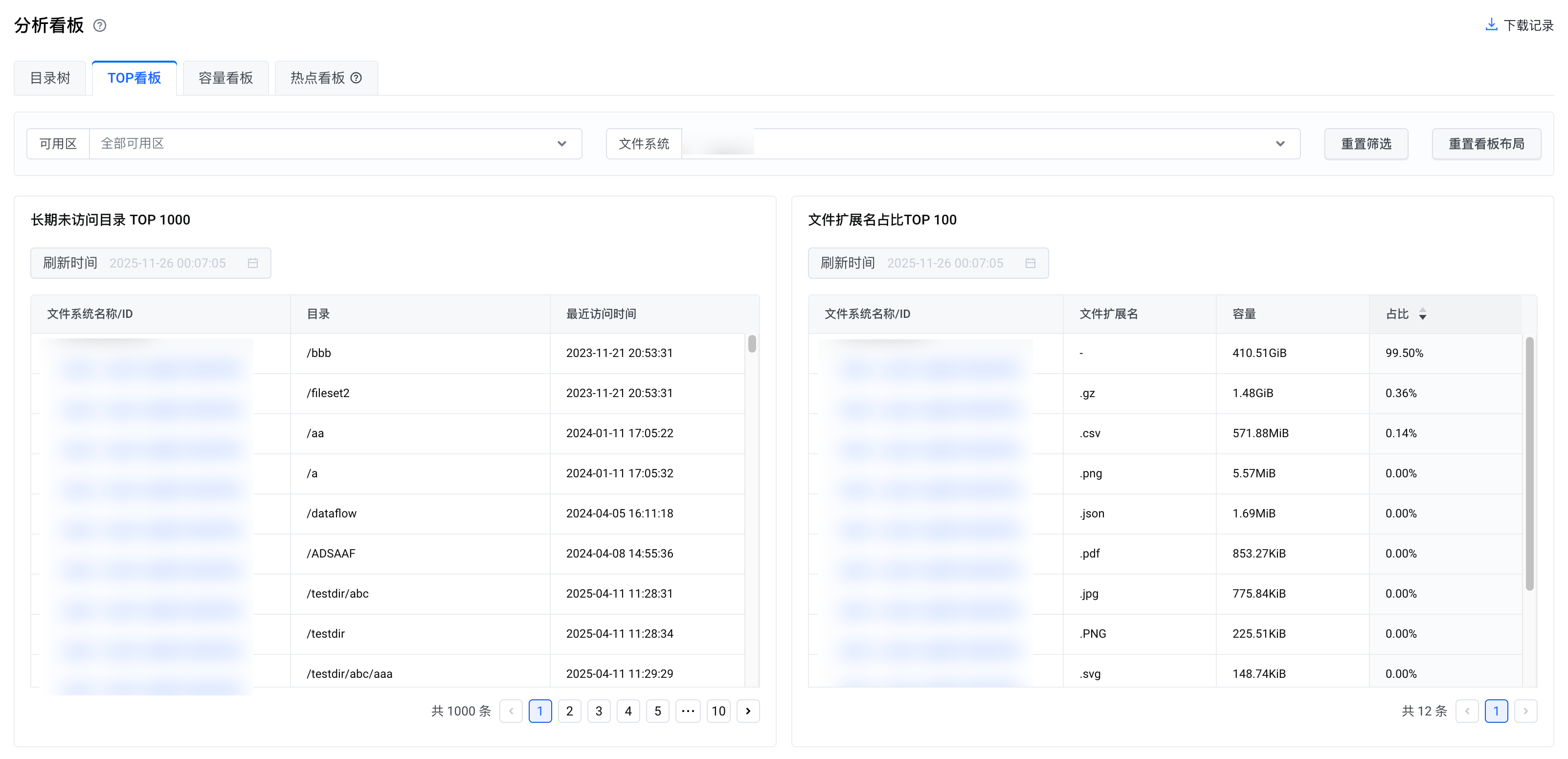 TOP 看板:内置多种属性的 TOP 列表,包括长期未访问目录、容量增长或减少最快的目录、文件扩展名占比,以及 Fileset 已用容量与文件数等。借助此系列看板,用户能够从不同维度,全面掌握文件系统的使用情况。再结合具体的业务场景,便可判断文件系统的使用健康度,进一步明确下钻异常数据的方向。