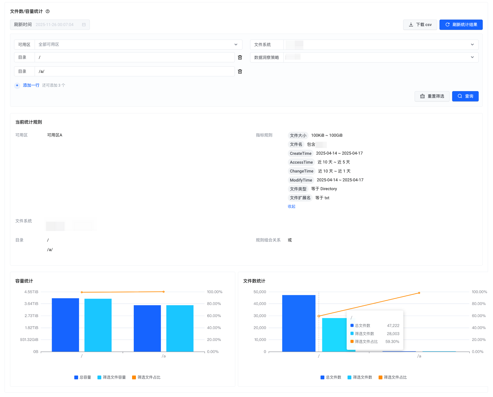 文件数和容量统计:系统将依据用户配置的目录及统计规则,提供指定目录的文件数量与容量统计数据,以及该目录下符合规则的文件数量与容量统计数据,并计算出各自的占比情况。如此一来,用户能够清晰地知晓某个目录下符合(或不符合)预期的文件占比,进而实现更为有效的数据管理。
