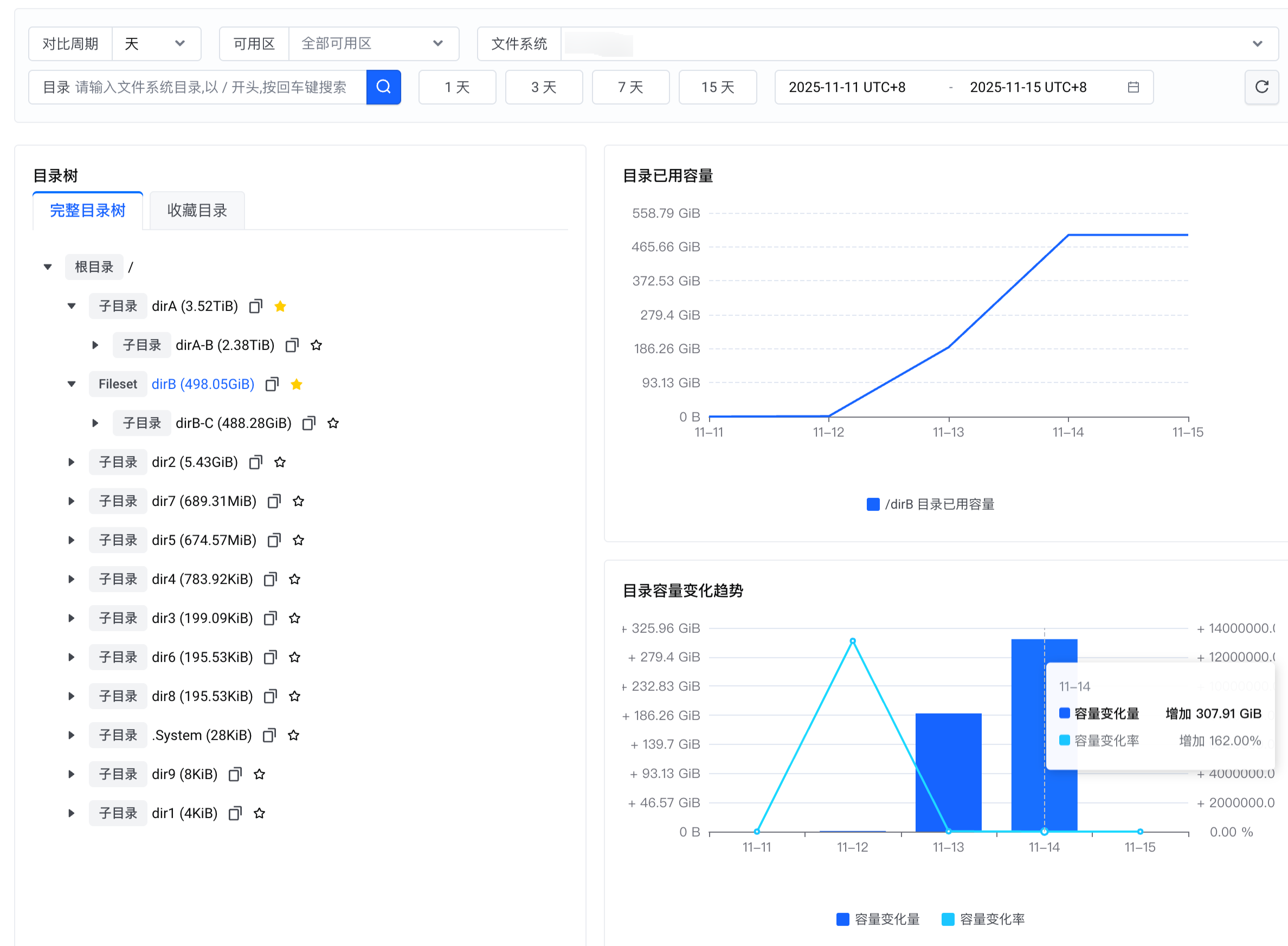 存储全局视图:提供完整的文件系统目录树可视化查询,用户可快速定位目标目录,查看任意目录的容量增长曲线与增量占比。