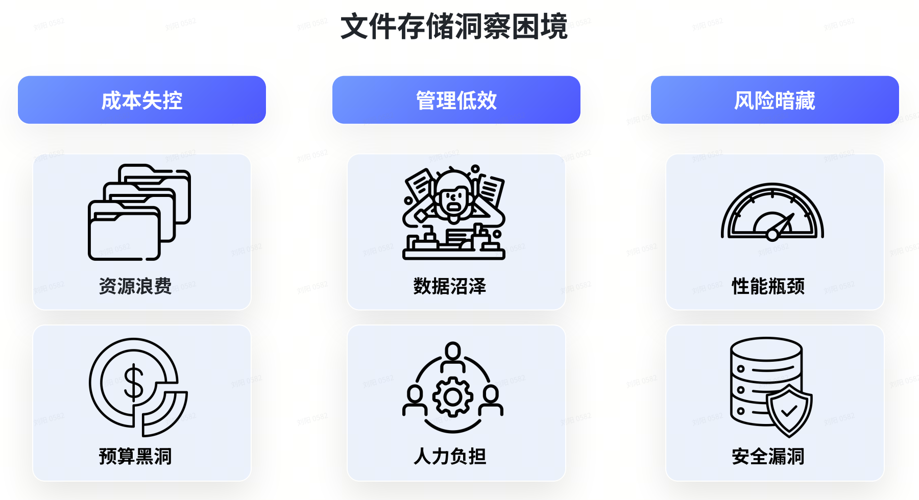 资源浪费:大量冷数据、冗余数据长期占用昂贵的高性能文件存储,导致存储成本居高不下。