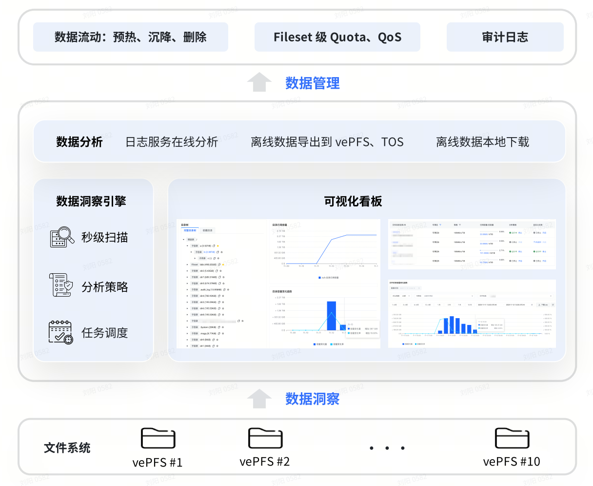 不止于“看”,更在于“行动”:数据洞察的终极目标是驱动行动。用户可基于分析结果,联动 vePFS 的 Quota、QoS、数据流动、审计日志等功能,进一步执行数据的管理、归档、删除等操作,形成从洞察到优化的完整闭环。