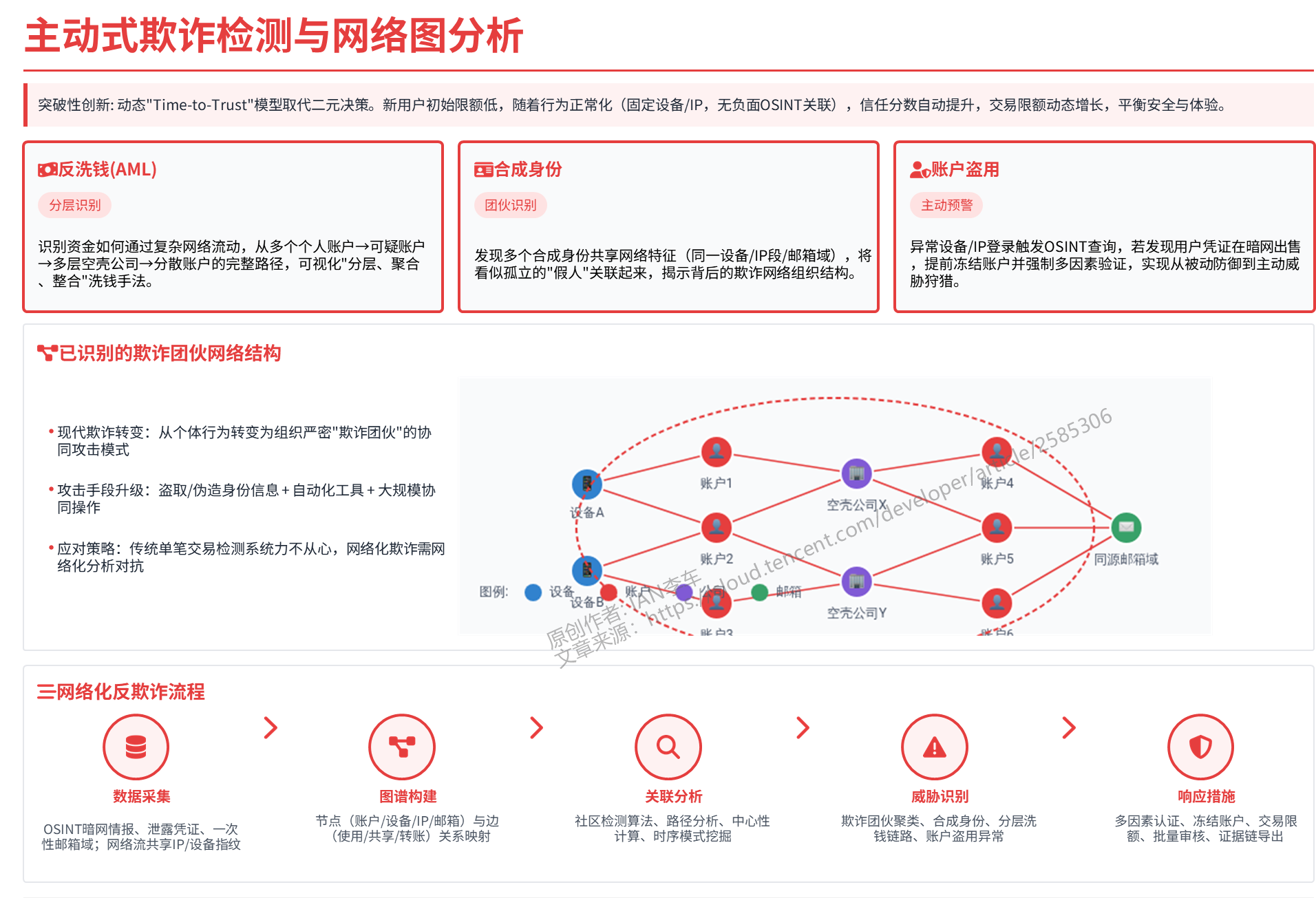 合成身份欺诈: 合成身份是欺诈者利用真实的个人信息片段(如从数据泄露中获得的社保号码,来自 OSINT)和虚构的信息组合而成的新身份。通过图分析,可以发现多个合成身份共享了某些网络特征(如同一设备或 IP 段),从而将这些看似孤立的“假人”关联起来,揭示其背后的欺诈网络。