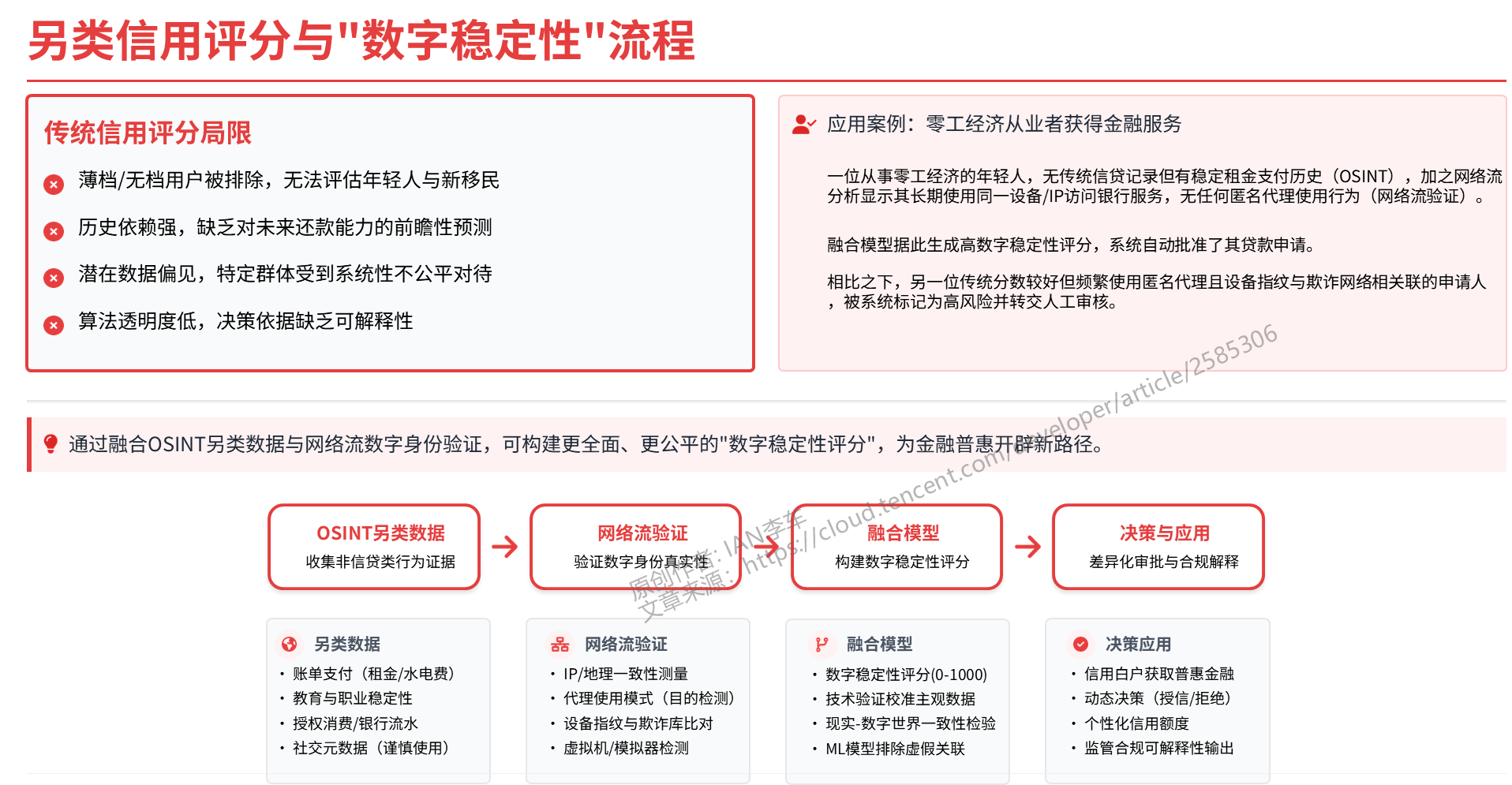 这种融合方法的深层价值在于,它能够利用客观的技术数据来校准和验证可能带有主观偏见的另类数据。例如,使用社交媒体数据进行信用评估一直备受争议,因为它可能无意中引入对特定社会群体的偏见。而网络流数据本质上是技术性的,它衡量的是连接的参数,而非用户的社会属性。当一个模型可能从 OSINT 数据中学到某种虚假的关联时,稳定且安全的网络行为可以提供一个强有力的反证信号。因此,网络流数据就像一个“地面真实性”的锚,它为更主观、更易产生偏见的 OSINT 数据提供了一个客观的验证层,使得整个信用评估模型更加稳健、公平,并且在监管审查面前更具说服力。