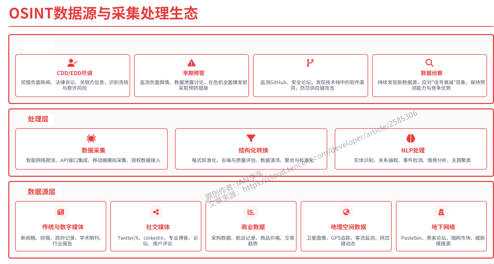 开源情报(OSINT)是指对公开可用的信息进行收集和分析,以生成可操作的情报。在金融科技领域,OSINT 不再是边缘情报来源,而是构成战略决策核心的关键数据资产。其生态系统涵盖了广泛且多样化的数据源,为金融机构提供了前所未有的市场洞察力。