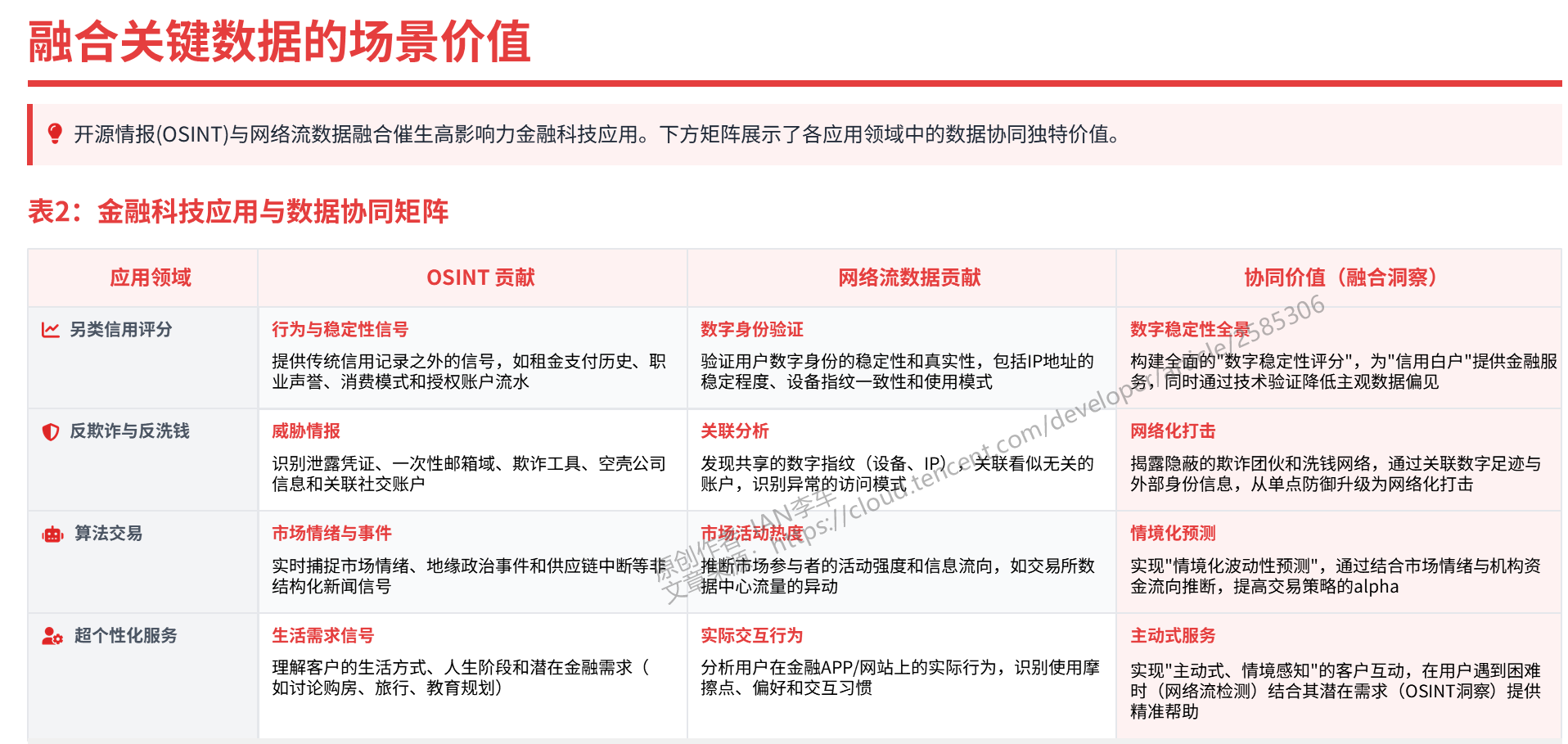 下方的矩阵图提供了一个战略概览,简明扼要地展示了数据融合在各个关键应用领域中的独特价值,详细探讨由开源情报和网络流数据融合所催生的具体、高影响力的金融科技应用场景。