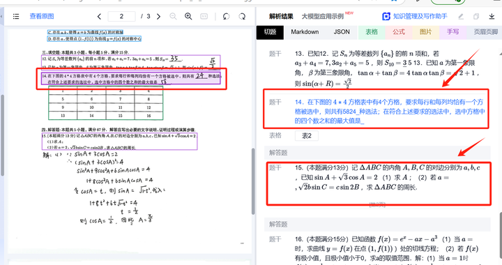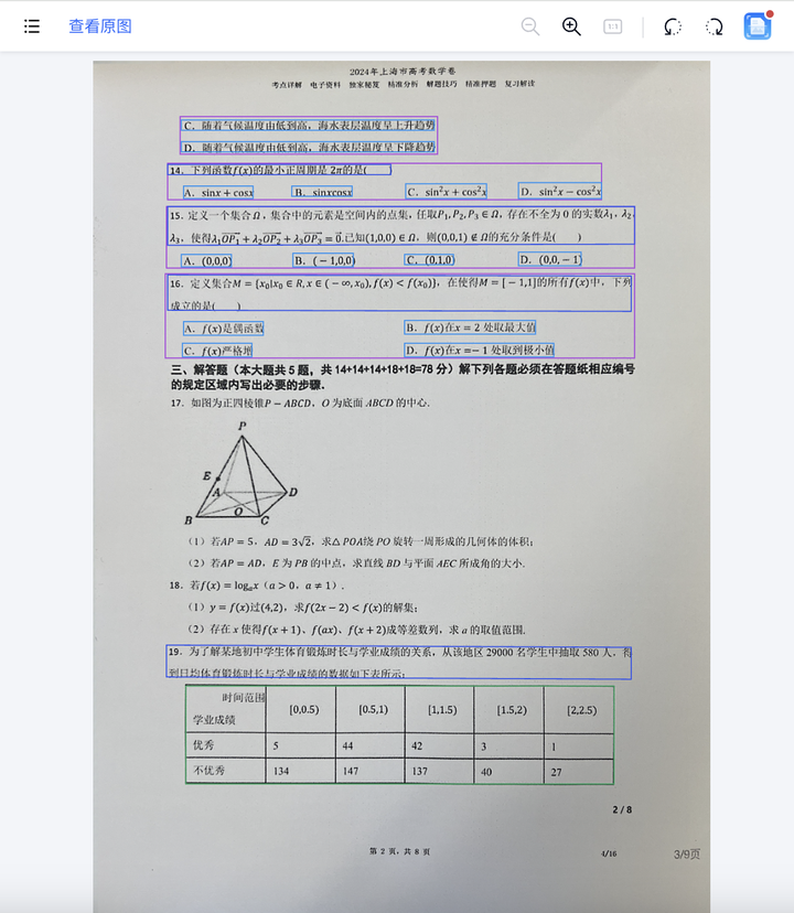 拍照搜题、题库录入和智能判题等场景应用在当下非常普遍,文档解析过程中的切题能力可以大幅度提高后续处理的效率和准确性。面对批量上传的试卷或习题册,传统 OCR 容易将整页内容识别为混合文本,而切题功能则能精准框选图像中的单道题目区域,分割每道独立题目,排除无关背景或相邻题目干扰,影响下一步识别的成败。