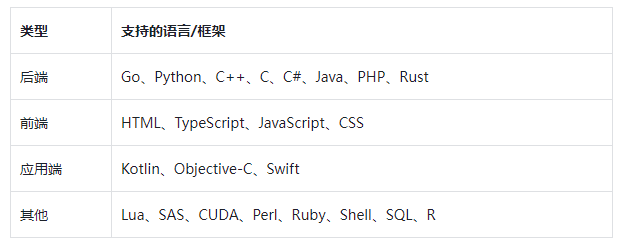 支持 Python、Java、C#、JavaScript、Typescript 等 15 种编程语言。