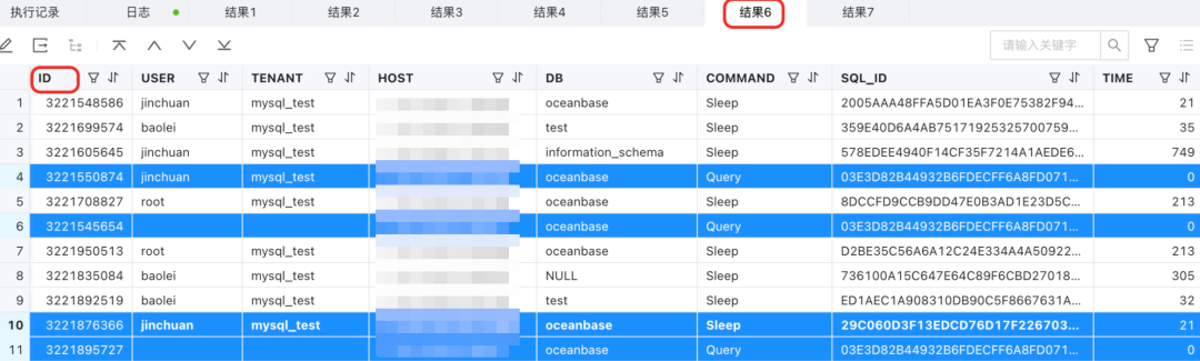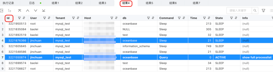 查看会话的视图,习惯是一个会话是展示一行(因为在同一时刻,一个会话中只能执行一条 SQL)。其实 OceanBase 这里有 2 种展示模式,show processlist 是一个会话 C 连接的维度,show full processlist 就是展示 S 连接的维度(会有多条)。可以想见同一个会话中,最多也只有一条在工作,其他的都是 sleep。