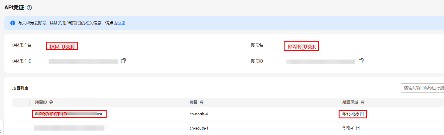 进入 API 凭证界面,即可获取 IAM 用户信息,记录 IAM 用户名、账号名、区域华北-北京四对应的项目 ID,留作后面步骤使用。