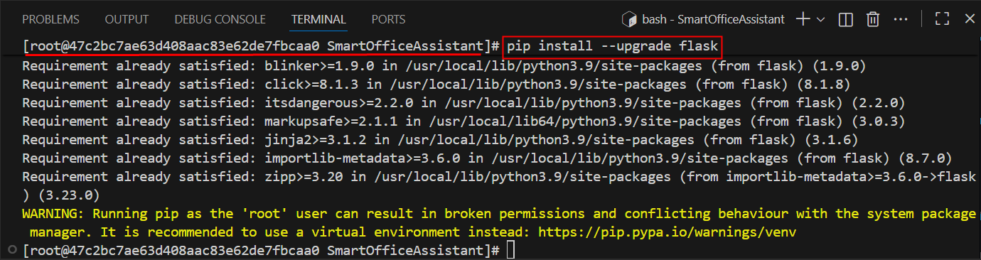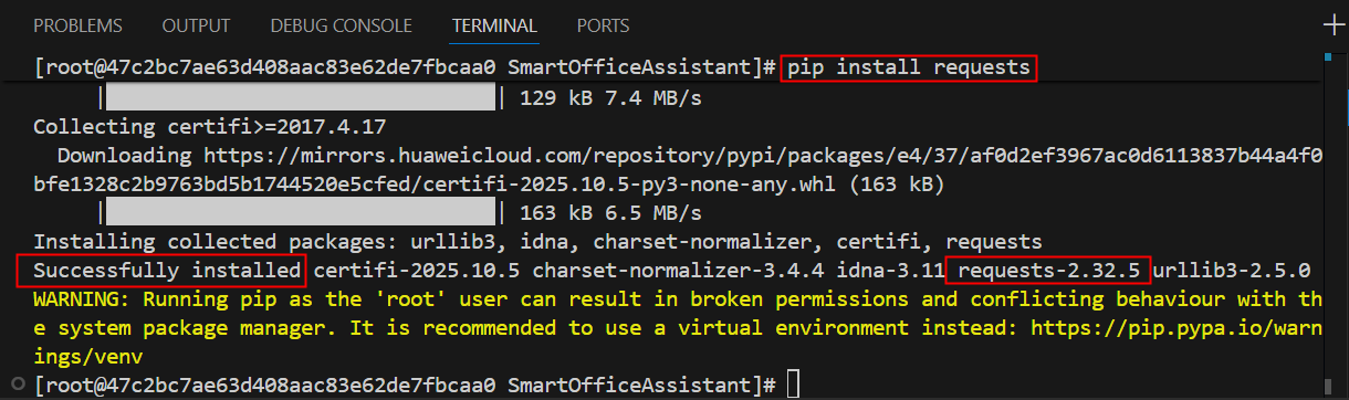 按下 Ctrl+Shift+`,打开 Terninal 窗口,选择 SmartOfficeAssistant 目录,安装 requests。