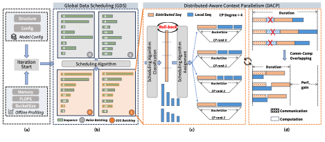 为了保持长文本处理能力同时提升短文本的训练效率,Skrull 在每个 iteration 动态地将训练数据分为两组(分布式计算的数据组和局部计算的数据组)。分布式计算组如同上下文并行的机制一样,将训练数据切分到不同的 GPU 上计算,并通过通信传输 attention 计算所需的 Key/Value Cache。局部计算的数据将被完整分配到上下文并行组的某个 GPU 上,以避免额外的通信和提升计算效率。于此同时,由于两组计算没有依赖性,分布式计算的通信时间可以与局部计算重叠,进一步提升性能。