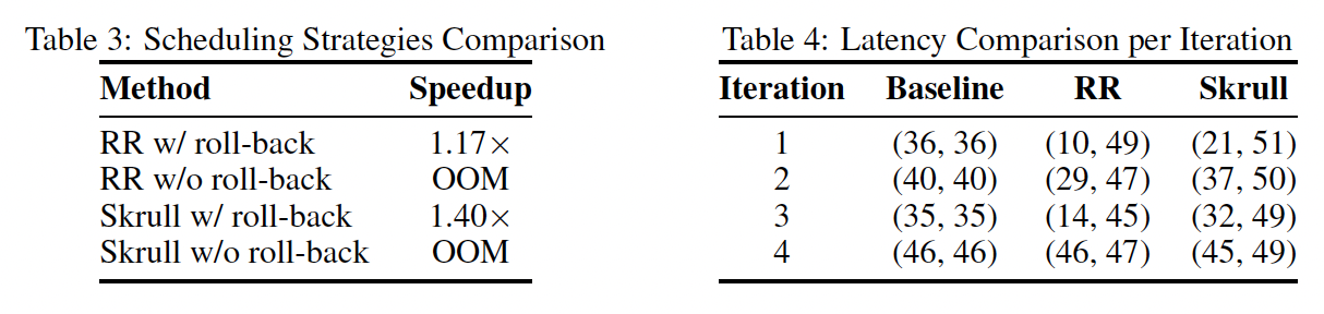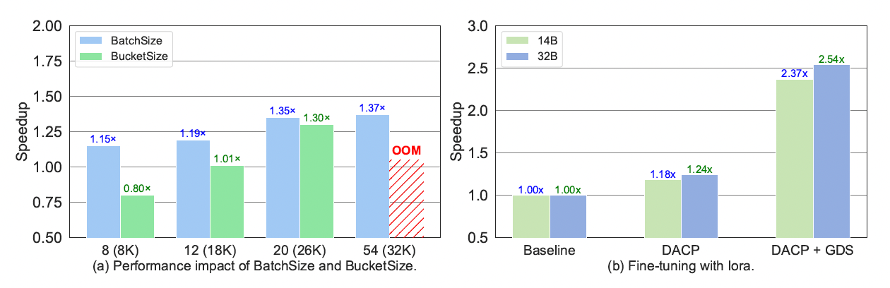 同时,我们测试了不同 BatchSize 和 BucketSize 设定对于性能的影响、更大尺寸模型以及高效微调方法 Lora 的兼容性(如下图所示)。进一步的消融实验和分析(如下表所示)展示出 Skrull 的启发式策略以及回滚机制对于性能提升的重要性。