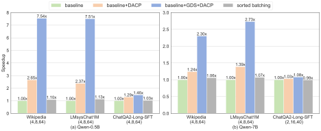 在多种尺寸的 Qwen 系列模型中验证系统收益。选取了三个数据集,分别代表常见的长尾和双峰分布。(注:前两个数据集不是专用于长文本微调场景但是其数据分布与该场景极为相似)。下图展示了在不同配置下 Qwen-0.5B 和 Qwen-7B 相对于 DeepSpeed(Zero-2)和简单排序(sorted batching)均取得了显著的加速。
