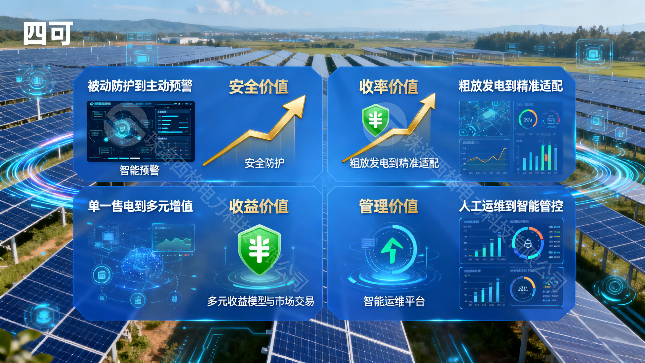在智能光伏时代,“四可”技术已不再是单纯的技术配置,而是重塑电站价值体系的核心力量——它以“可观、可测”实现状态透明与数据精准,以“可控、可调”保障安全稳定与价值优化,从安全、效率、收益、管理四个维度全面提升电站综合价值。这种价值提升的本质,是光伏电站从“重建设轻运营”的粗放模式,向“精益化、智能化、多元化”的高质量模式转型。随着“四可”技术与数字孪生、区块链等新技术的深度融合,光伏电站的综合价值将进一步释放,不仅为投资者带来更高回报,更将为新型电力系统建设与“双碳”目标实现注入强劲动力。
