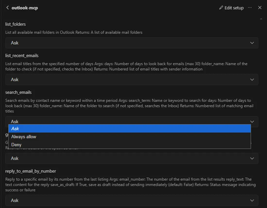 添加完成后,系统会自动激活该 MCP Server,点击进去可以看到提供的具体功能,并可以配置是否运行执行:
