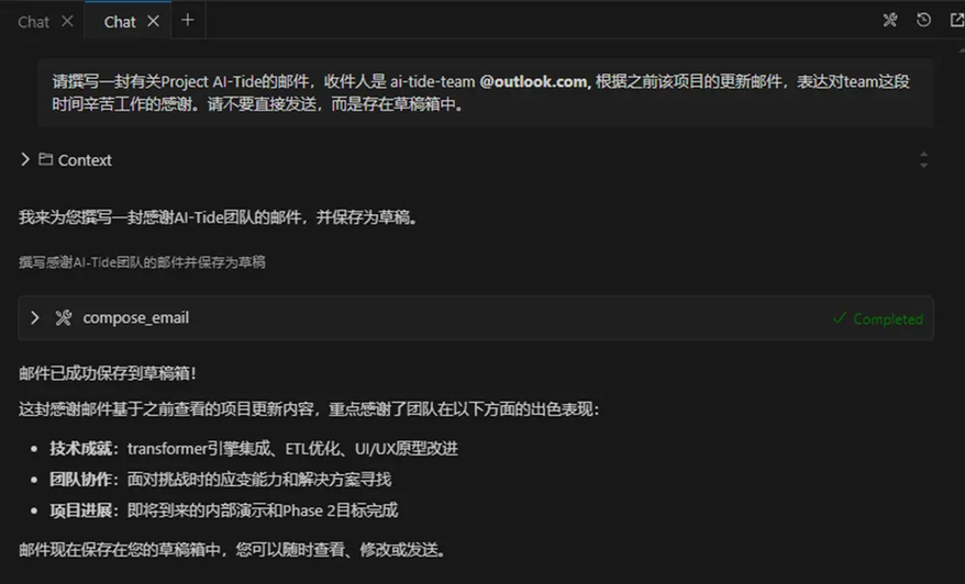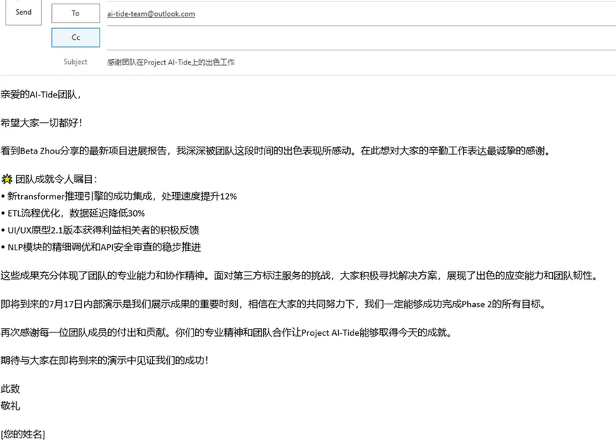 用户需求:“请撰写一封有关 Project AI-Tide 的邮件,收件人是 ai-tide-team @outlook.com, 根据之前该项目的更新邮件,表达对 team 这段时间辛苦工作的感谢。请不要直接发送,而是存在草稿箱中。”