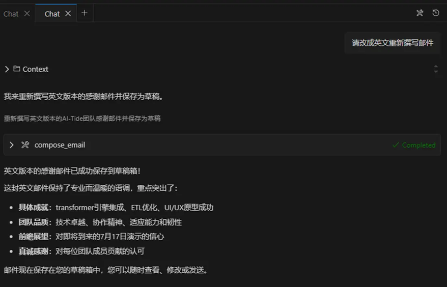 我们发现 Amazon Q 生成的是中文邮件,可能是因为我们用中文来对话。后续我们可以明确提出要用英文写邮件: