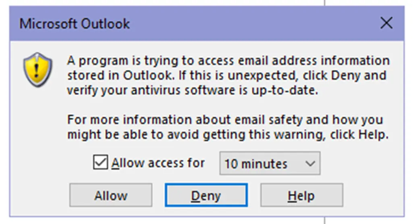 在 Outlook MCP Server 调用 Outlook 时会弹出一个是否允许的对话框,请点击 Allow,并且为了避免每次都要询问,可以运行 10 分钟。