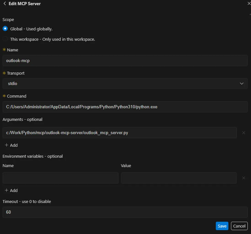 注意: 请将路径替换为您实际的 python.exe 和 outlook_mcp_server.py 文件路径。