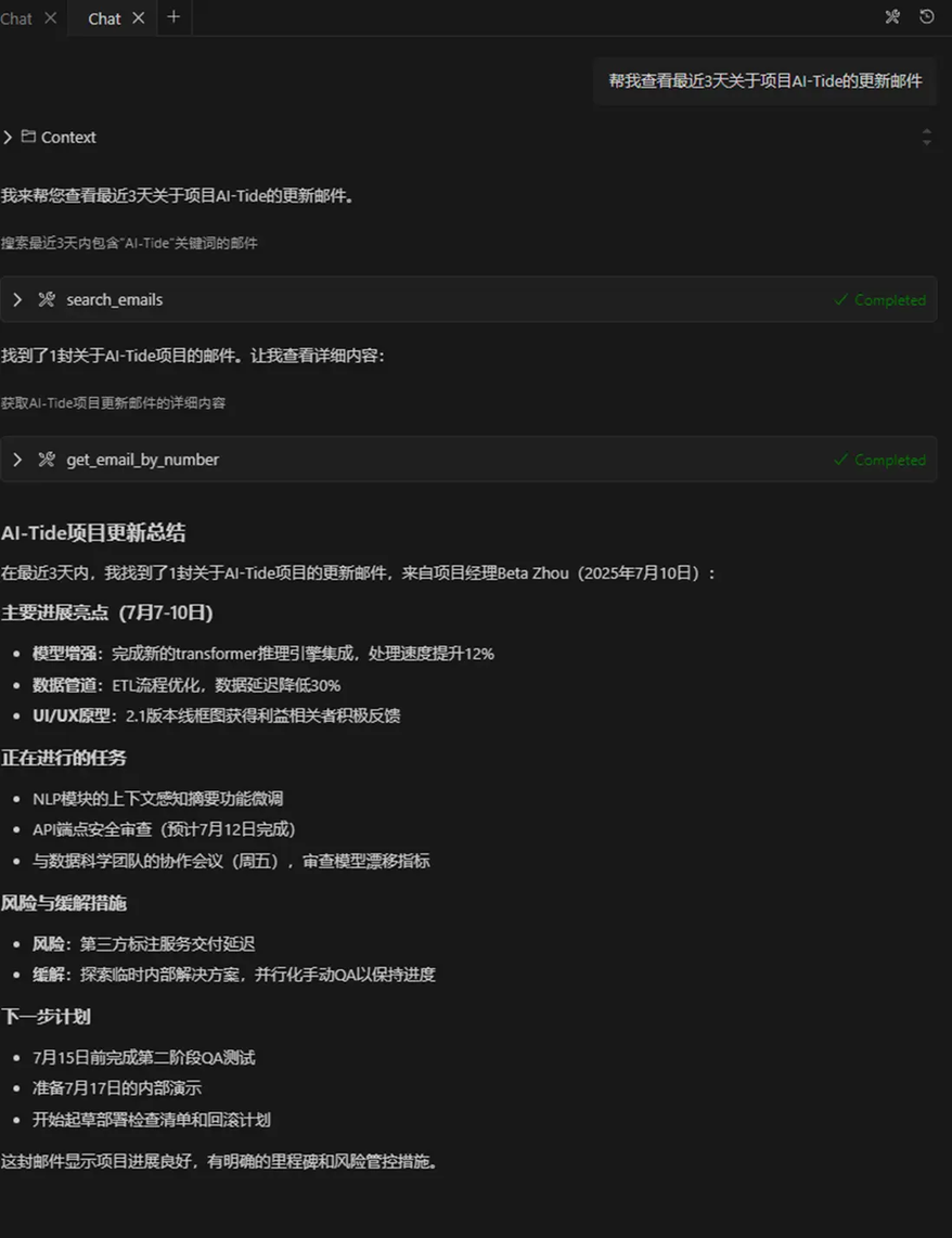 用户需求:”帮我查看最近 3 天关于项目 AI-Tide 的更新邮件”