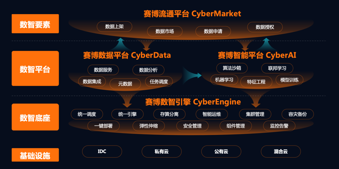 数新智能有三款核心产品:CyberData(数据平台)、CyberAI(智能平台)、CyberEngine(数智引擎)。客户可以单独购买,也可以组合购买,甚至可以把数新的平台和 AWS 的 EMR 搭配使用。其产品秉承开放兼容的理念,不绑定云底座、不挑客户。不管客户使用阿里云、AWS、华为云、谷歌云,还是 IDC 私有云,亦或是由多个云底座构建的混合云,数新的产品都能够兼容和输出。