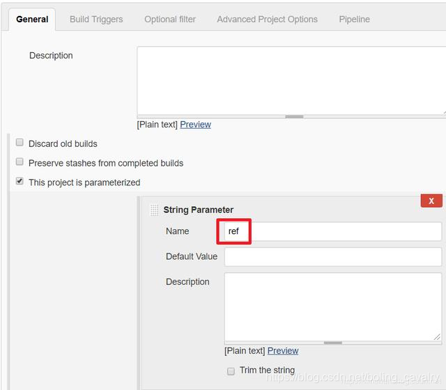 在参数的编辑框中,Name 字段填写 ref ,如下图红框所示,注意这个参数在上一篇文章中在 Generic Webhook Trigger 的参数中设置过,是个固定参数,插件会用到: