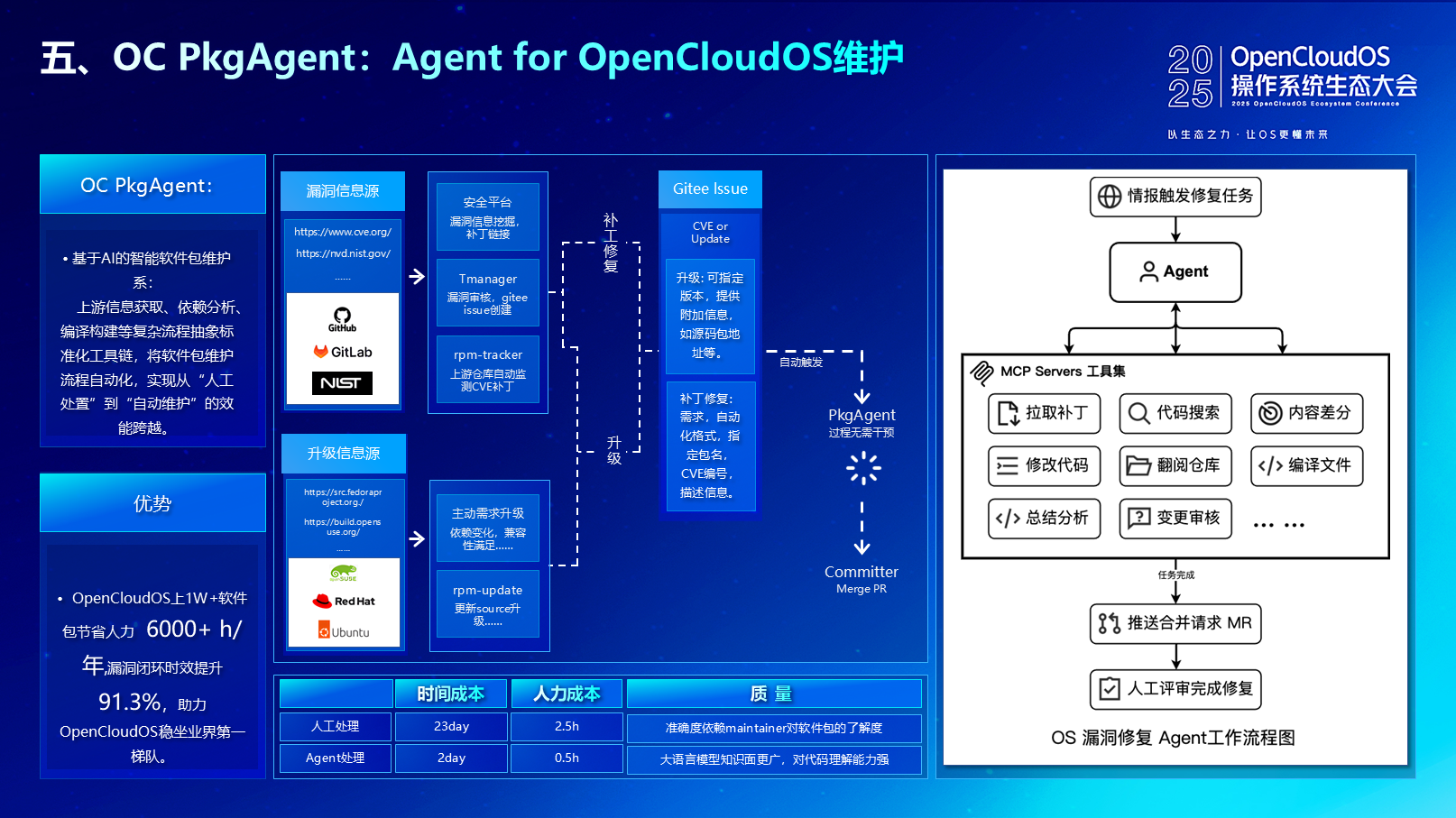 OC PkgAgent—— 智能软件包自动管理维护:为保障发行版的持续安全与稳定,OpenCloudOS 需要实时跟进上游社区海量的安全补丁与功能更新,为此推出的 PkgAgent 智能体系统,通过 AI 多智能体协同技术实现软件包管理的自动化革新,可将单个软件包处理时间从平均 2.5 小时缩短至分钟级,预计每年可节省超过 6000 小时的人力投入,并将漏洞修复的闭环效率提升了 91.3%,显著增强了系统安全性与迭代敏捷性。