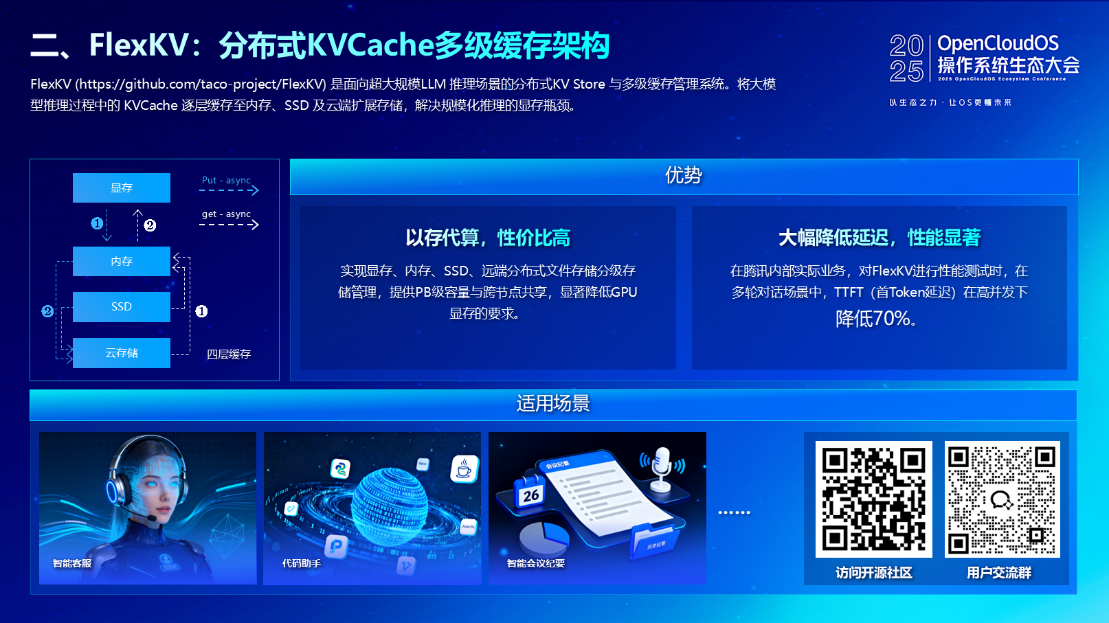 FlexKV—— 大幅降低推理与延迟:FlexKV 是面向超大规模 LLM 推理场景的分布式 KV Store 与多级缓存管理系统,这项技术通过将大模型推理过程中的 KVCache 逐层缓存至内存、SSD 及云端扩展存储(例如 GooseFS),有效解决了规模化推理的显存瓶颈。在实际应用中,FlexKV 展现出显著性能优势。在增强搜索场景下,TTFT(首 Token 延迟)在高并发下降低了 70%;在智能问答助手场景中,对话时延降低了 57%。