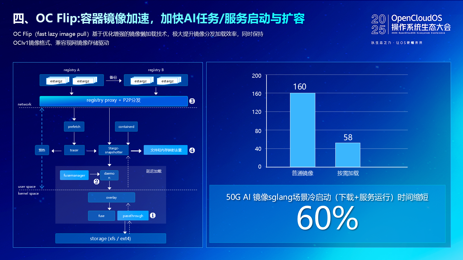OC Flip—— 容器镜像加速,加快集群启动与模型分发:在 AI 场景下,大规模集群冷启动时,常面临数十 GB 的镜像与模型文件需同时拉取的困境。受限于中心仓库带宽,往往导致集群冷启动时下载缓慢、耗时长,且镜像拉取时间占启动流程比重过高、本地读取效率不佳。为此,OC Flip(fast lazy image pull)基于优化增强的镜像懒加载技术,极大提升镜像分发加载效率,同时保持 OCIv1 镜像格式、兼容现网镜像存储驱动,实现了从 “全部下载” 到 “即用即取” 的转变。50G AI 镜像 sglang 场景冷启动(下载 + 服务运行)时间缩短 60%。