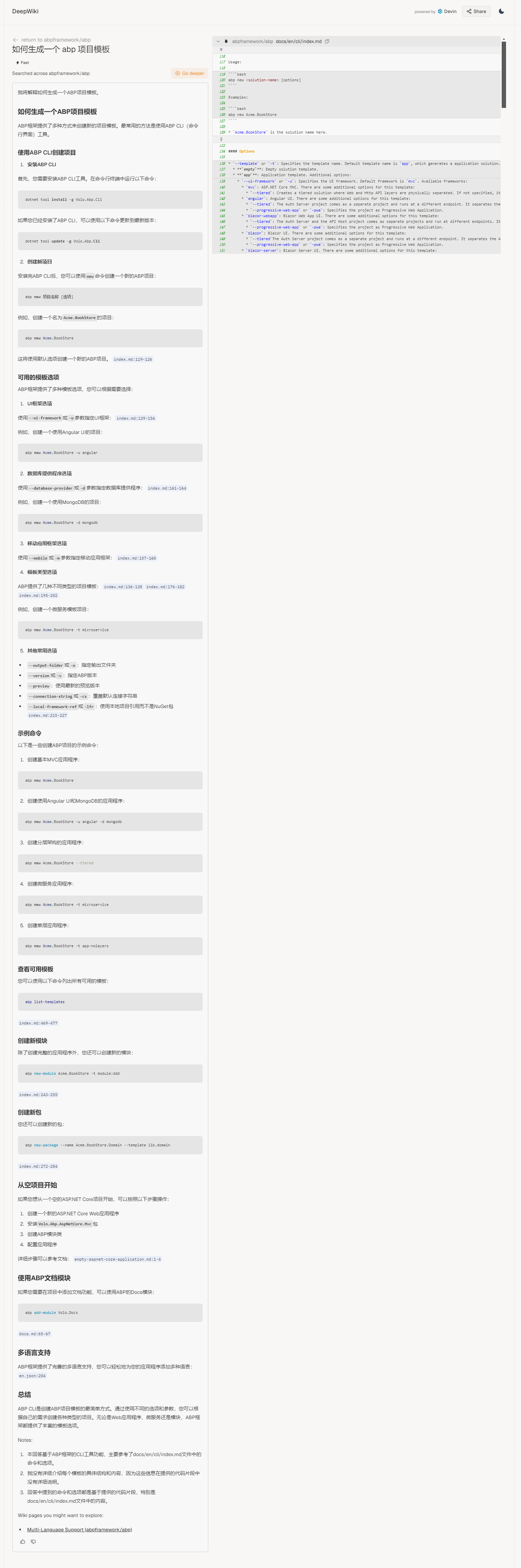 直接一键就给我们生成了 abp 源代码的项目详细 Wiki 文档: