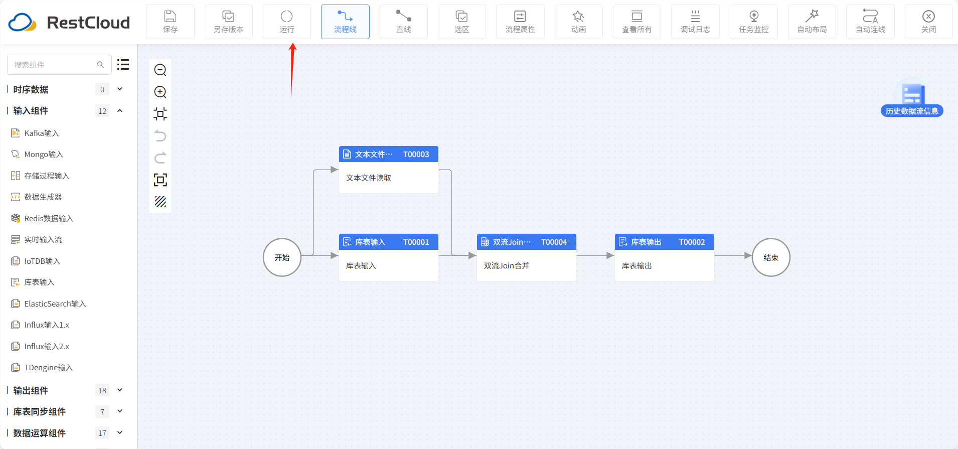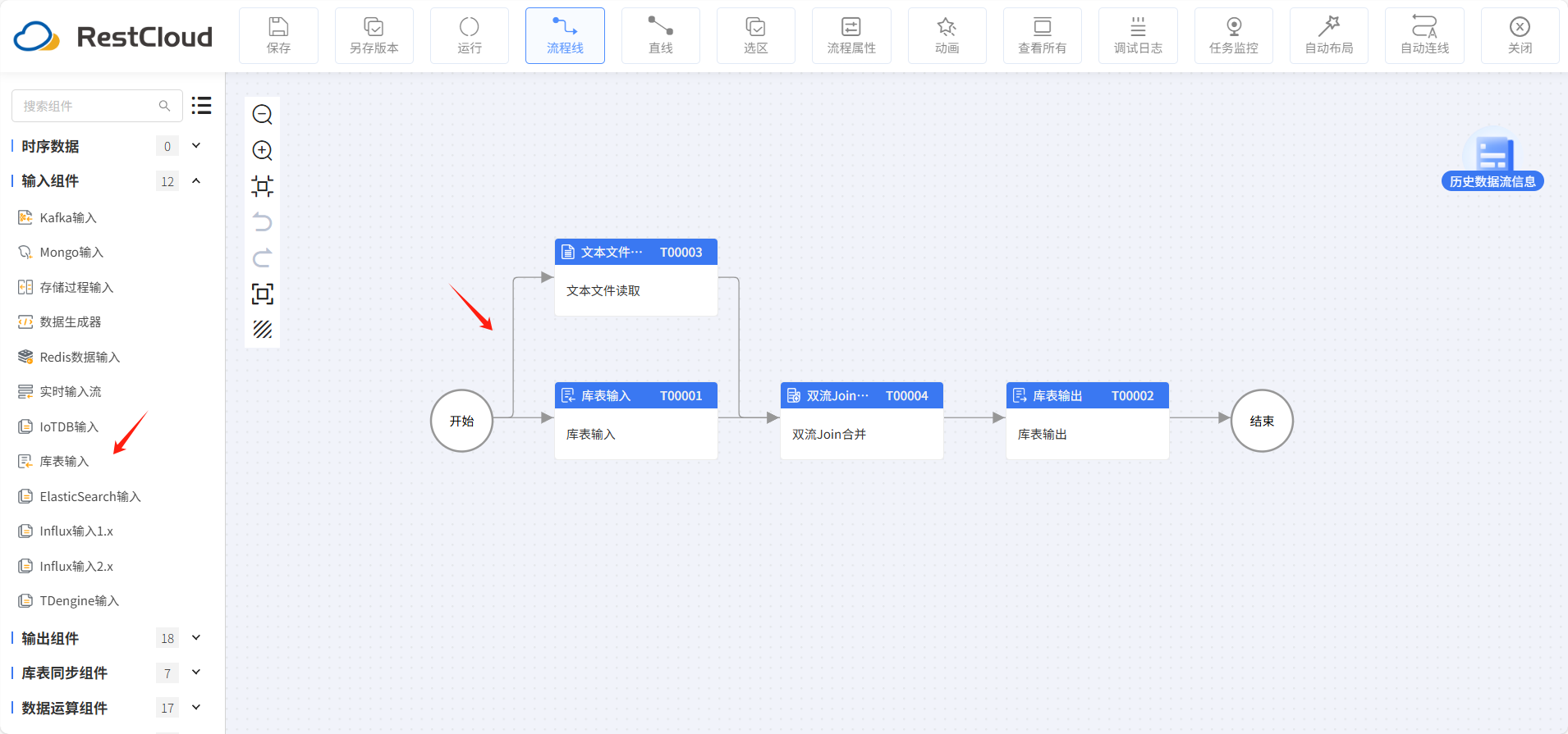 在流程设计里面,我们从组件列表拉取库表输入,文本文件读取,双流 join 合并和库表输出组件,通过路由线依次链接。这个流程的作用使使用库表输入读取 MySQL 的学生成绩表数据,文本文件读取组件来读取文本文件学生班级.csv 的文件数据,再用过双流 join 打宽之后通过库表输出同步到人大金仓数据库中。