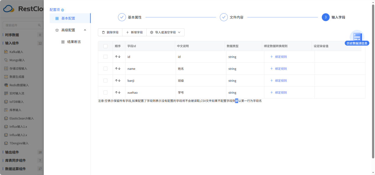 不填写字段则默认将第一行数据作为字段名,第二行开始作为数据,这里为了方便后面双流 join 配置,所以填写了字段信息。配置完成后点击保存。