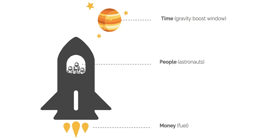 火箭飞船能够行驶多远取决于所携带的燃料、机组人员的素质以及利用其他天体(如木星)的引力助推的能力这一受时间限制的因素。同样,产品团队发布产品的时候,也会受到 资金、人员和时间 限制。产品团队的任何一次任务都会受到这三方面因素的限制。