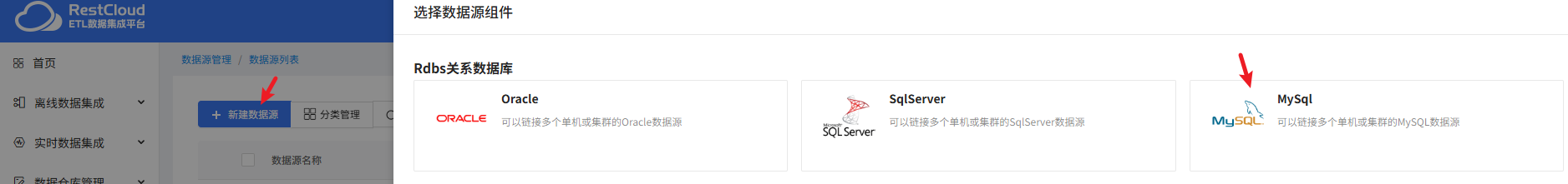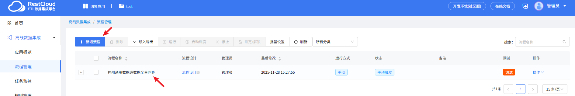 配置完源端与目标端的数据源链接后,我们来配置数据的同步流程,找到离线数据集成模块,创建流程