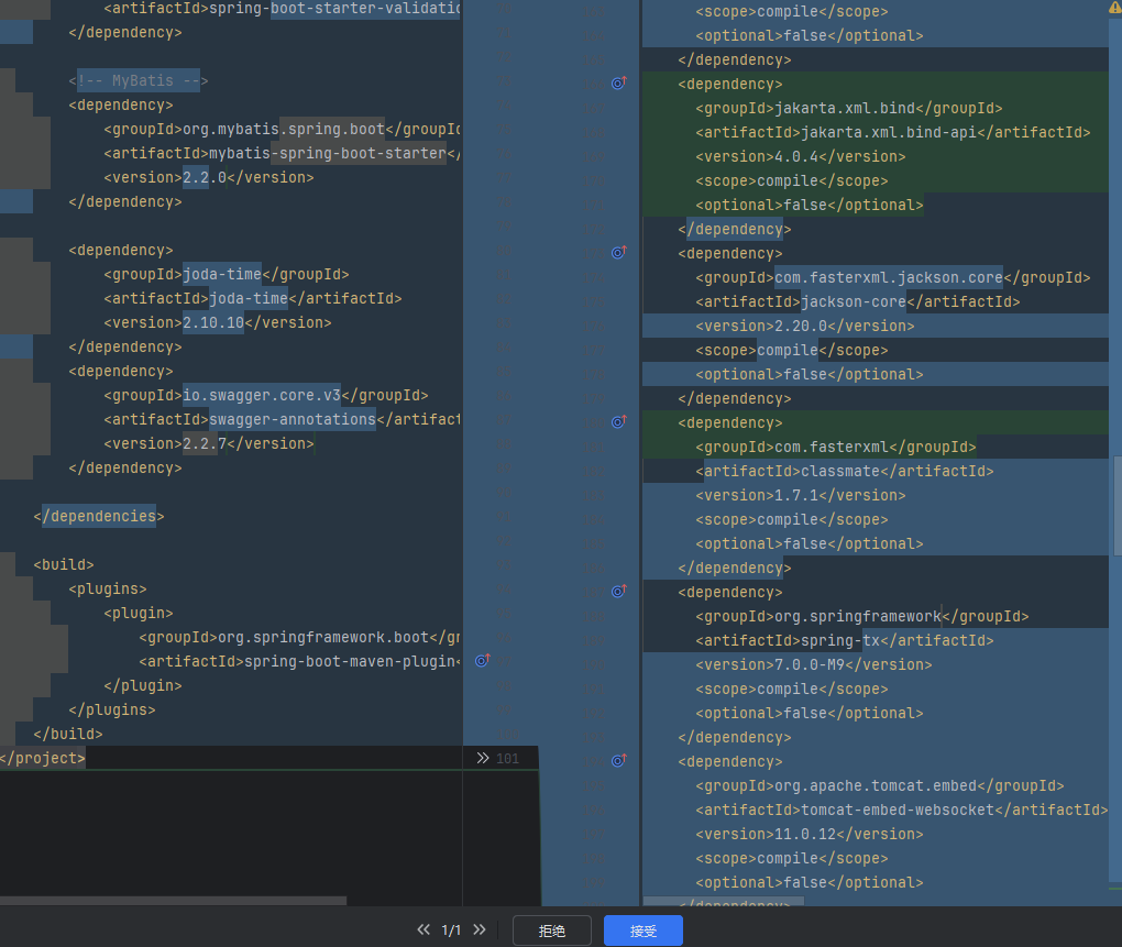 更进一步的是,它不仅指出问题,还会提供解决方案。例如,检测到 fastjson 有漏洞时,它会推荐升级到安全版本,并自动生成替换代码;发现 commons-io 是冗余依赖,则会提示可以安全删除;遇到 Spring Cloud 与 Spring Boot 版本不匹配的情况,它会给出最佳版本组合建议,甚至帮你修改 pom.xml 里的依赖配置。实际测试表明,原本需要半天时间才能梳理清楚的依赖问题,现在只需 10 分钟就能解决。