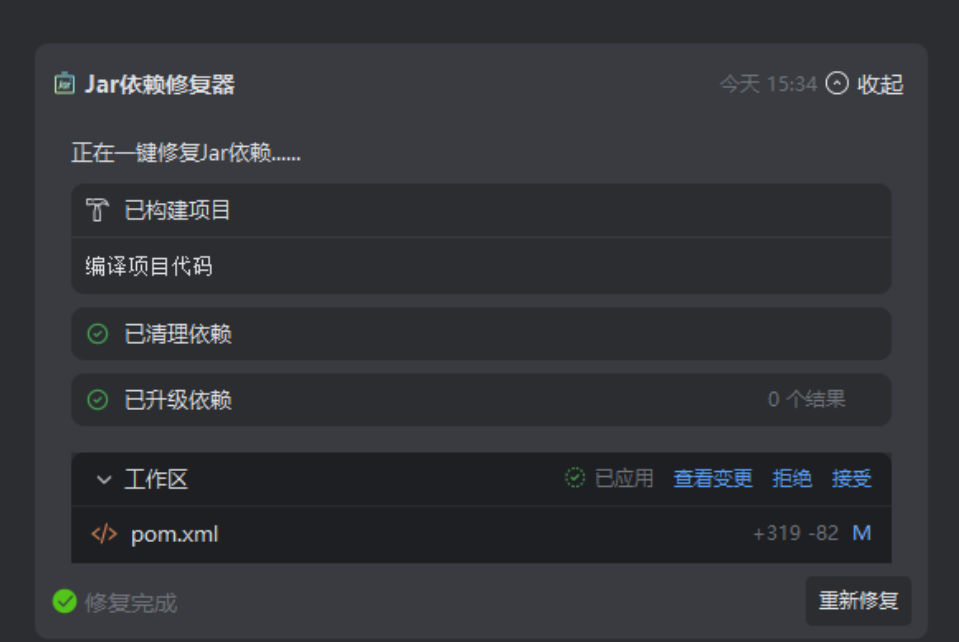 对于已经变得臃肿的项目,飞算 JavaAI 的“Jar 依赖修复器”就像一位“清道夫”。传统方法排查依赖冲突需要借助 Maven Helper 逐个检查依赖树,对比版本并寻找传递依赖,耗时且容易遗漏。而飞算 JavaAI 能一键扫描整个项目的 pom.xml,快速标记出三类主要问题: