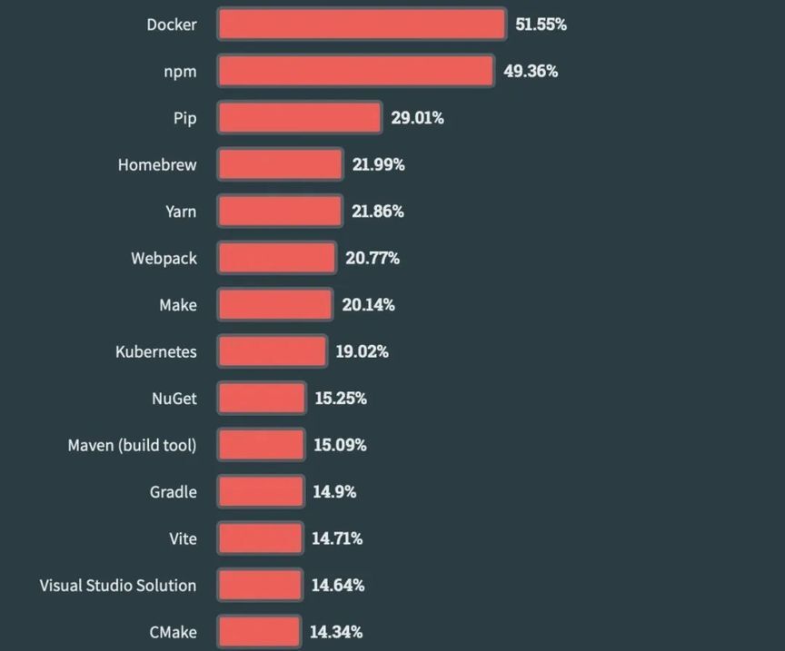 今年,Docker 是所有受访者中使用最多的其他工具 (53%),高于去年的第二位。