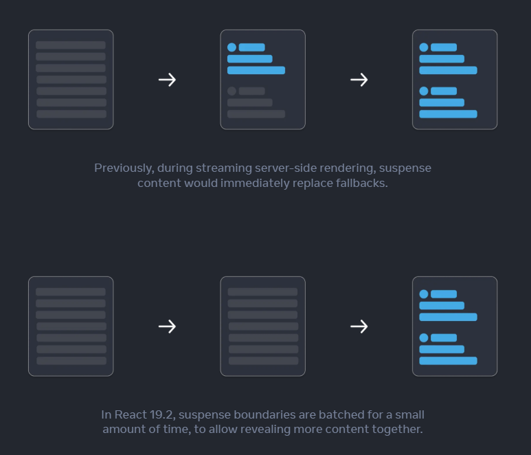 现在 React 会短暂等待一下,把多个 Suspense 边界的内容一起显示,体验更流畅。