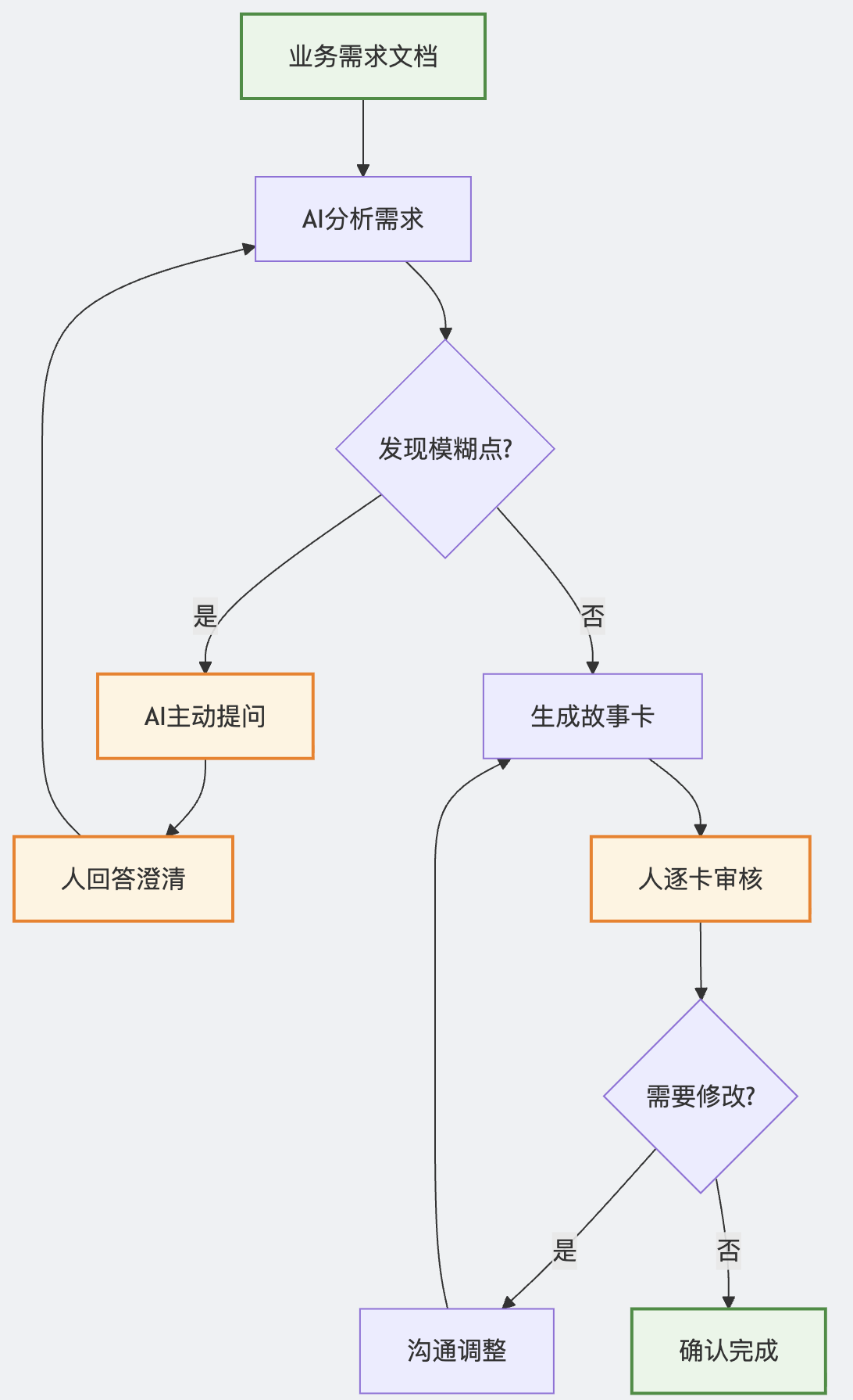 AI 提问澄清(数据录入方式、字段关联、状态流转等)